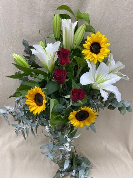 A beautiful bouquet with lasting flowers. White Oriental Lilies, Red roses and Yellow Sunflowers.